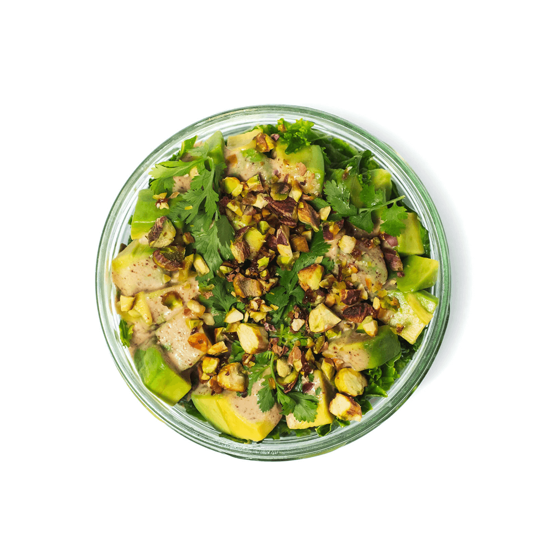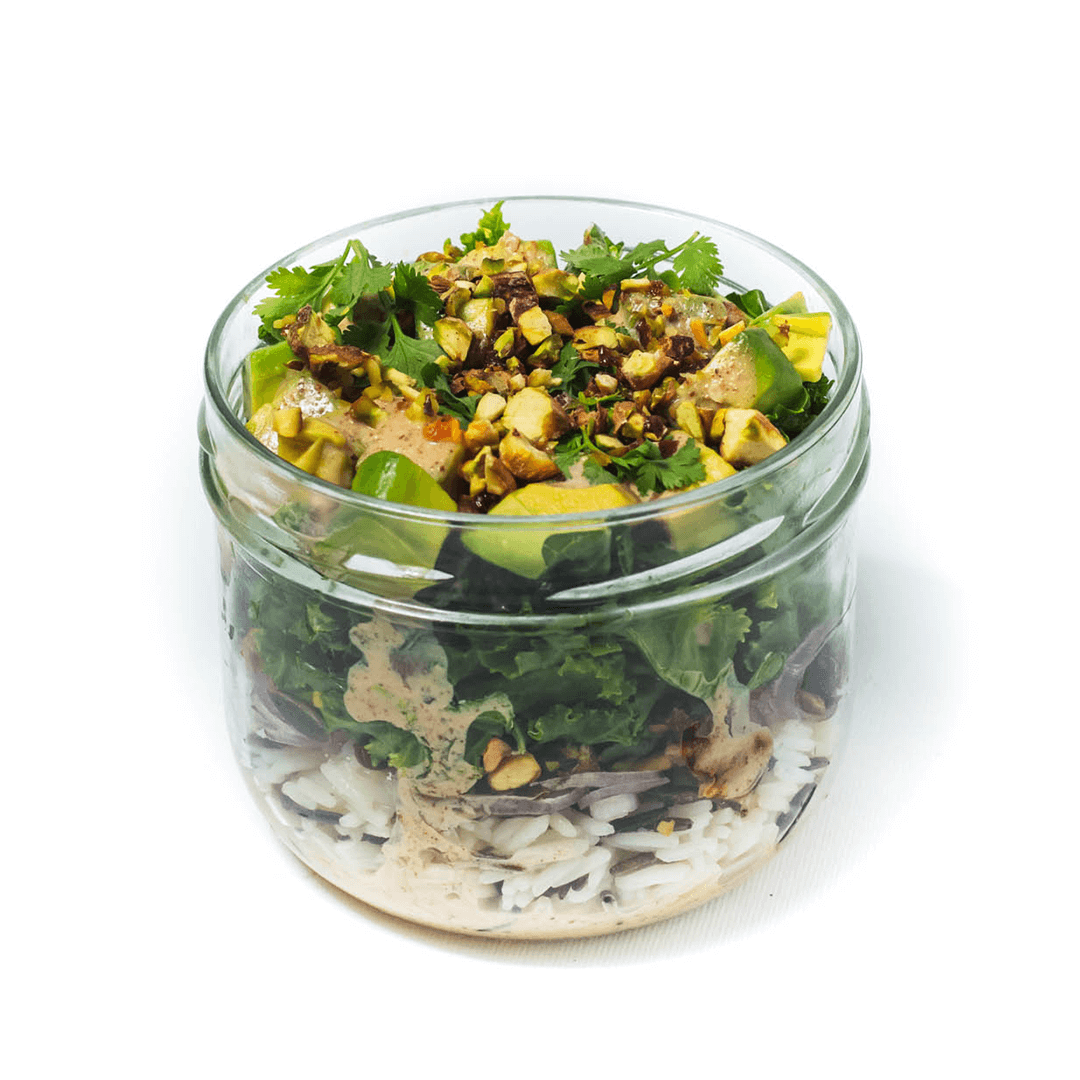 Arroz Selvagem 35%, Abacate 21%, Kale 13%, Sementes de Abóbora, Chalota, Limão, Amêndoa, Pistachio, Gengibre, Azeite, Mel, Sal, Coentros, Geleia de Agave e Malagueta