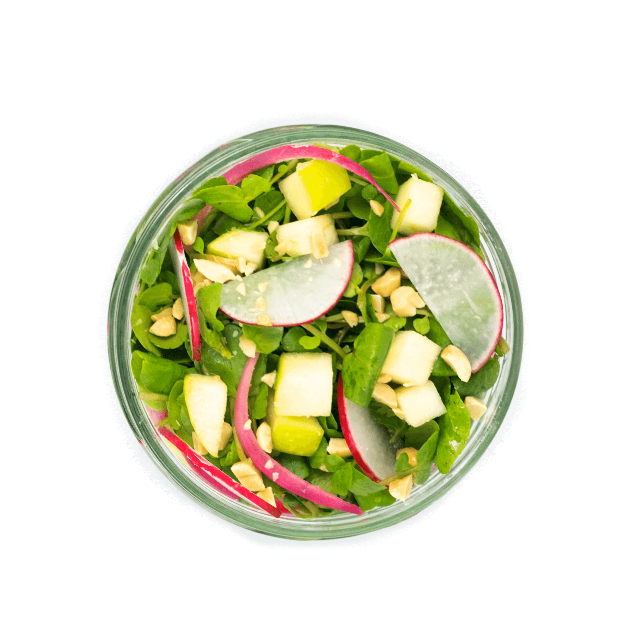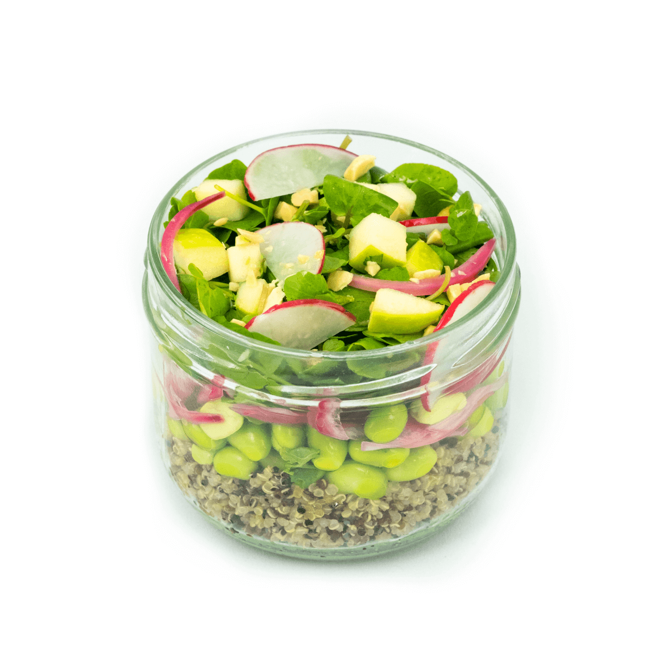Quinoa, Edamame (Soja), Agrião, Maçã, Cebola Roxa, Azeite, Vinagre Tinto, Molho de Soja, Mel, Óleo de Sésamo, Coentros, Rabanete, Amendoim e Sal.