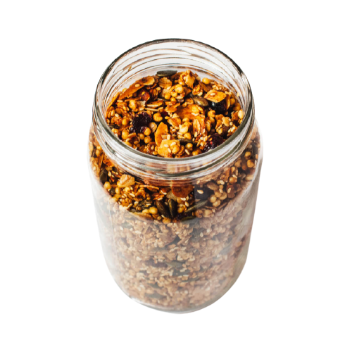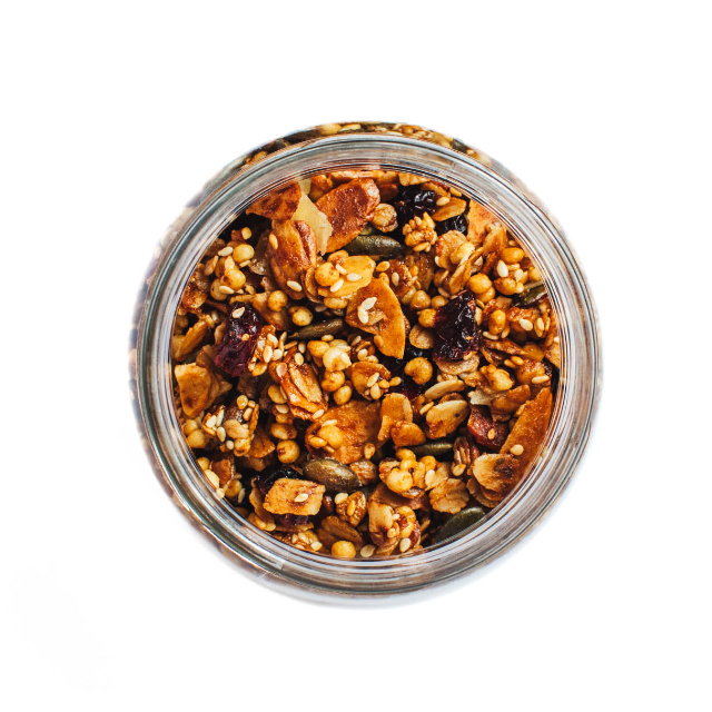 Aveia, Mel, Amêndoa, Sementes de Abóbora, Sementes de Sésamo, Óleo de Côco, Azeite, Arroz e Milho Tufados, Arandos e Sal.
